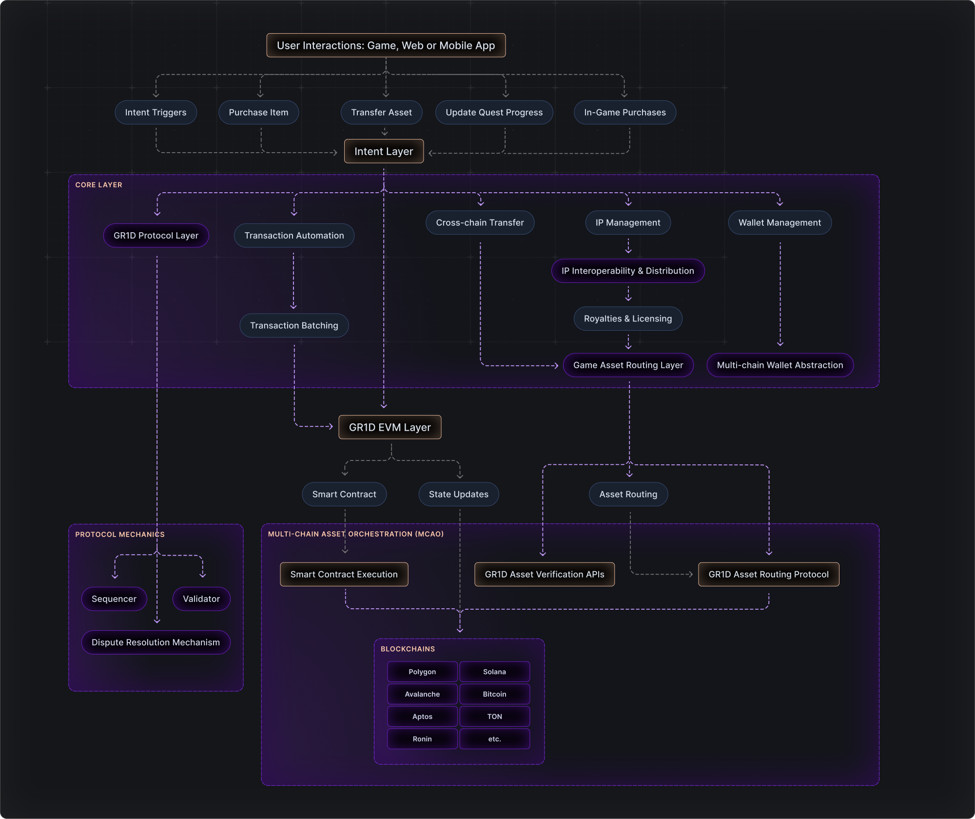 But it’s not just about making things easier for users and developers—intents are also a key part of GR1D’s strategy for scaling efficiently. The Intent Layer automates the processing of these high-level commands, which allows the network to manage complex interactions and high transaction volumes without breaking a sweat. This setup ensures that, as the GR1D ecosystem expands, the network remains fast and responsive, even when processing thousands of transactions or managing multiple cross-chain operations simultaneously.