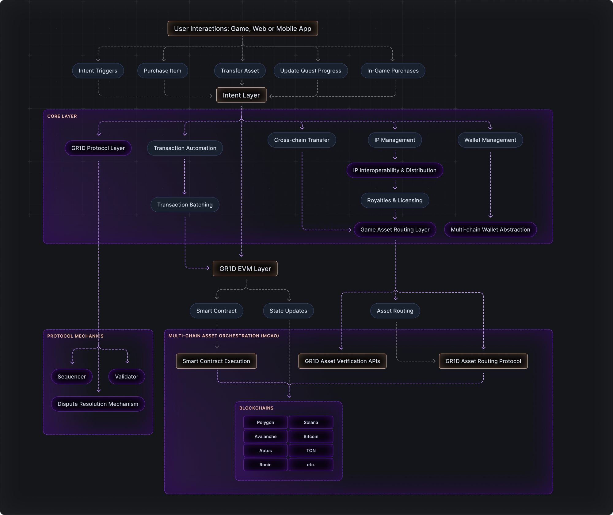 Now, when we say “seamless interoperability,” we mean it. The Intent Layer is what makes this possible. It acts as the bridge (no pun intended) that lets users move assets, interact with applications, and perform actions across multiple chains without hitting technical roadblocks. For example, when a user initiates an action like “send this token from Chain X to Chain Y,” GR1D’s intent system steps in, managing everything—asset transfer, cross-chain communication, and verification—so the user doesn’t have to think about any of it.